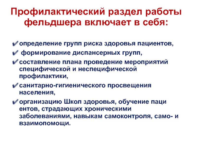 Слайд 18Профилактический раздел работы фельдшера включает в себя: