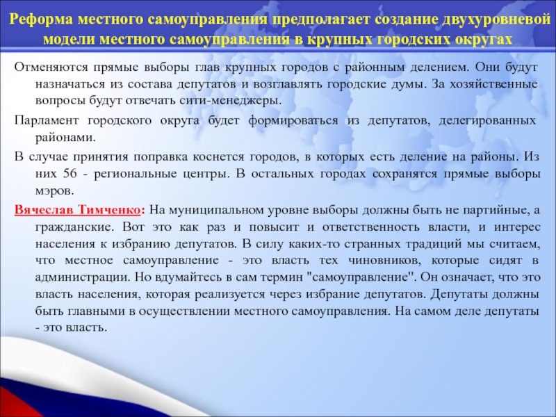 Реформа местного самоуправления предполагает создание двухуровневой модели местного самоуправления в крупных городских округах