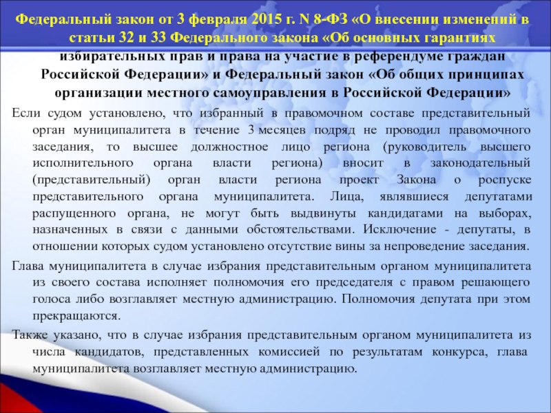 Если судом установлено, что избранный в правомочном составе представительный орган муниципалитета в течение 3 месяцев подряд не проводил правомочного заседания, то высшее должностное лицо региона (руководитель высшего исполнительного органа власти региона) вносит в законодательный (представительный) орган власти региона проект Закона о роспуске представительного органа муниципалитета. Лица, являвшиеся депутатами распущенного органа, не могут быть выдвинуты кандидатами на выборах, назначенных в связи с данными обстоятельствами. Исключение - депутаты, в отношении которых судом установлено отсутствие вины за непроведение заседания.