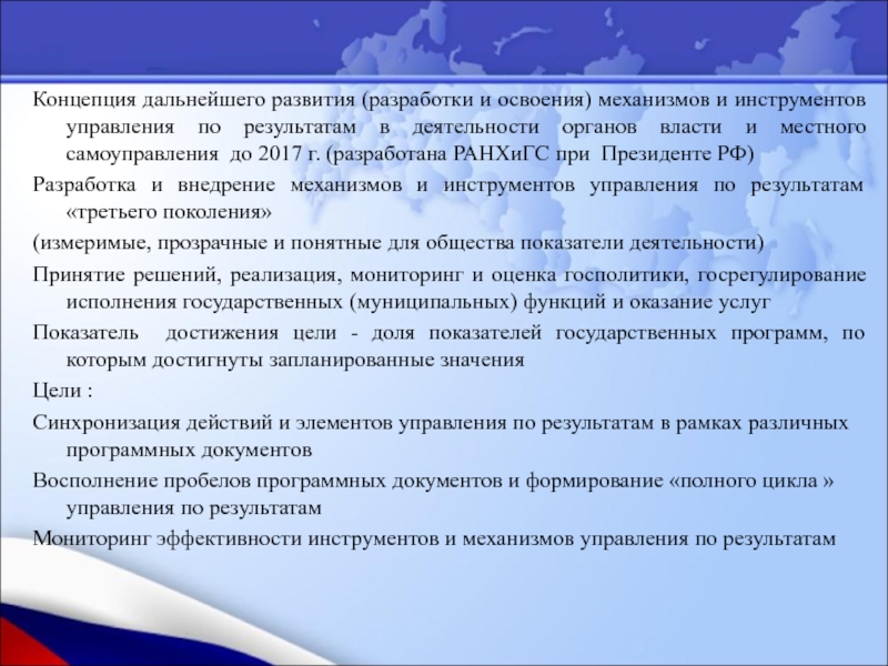 Слайд 13Концепция дальнейшего развития (разработки и освоения) механизмов и инструментов управления
