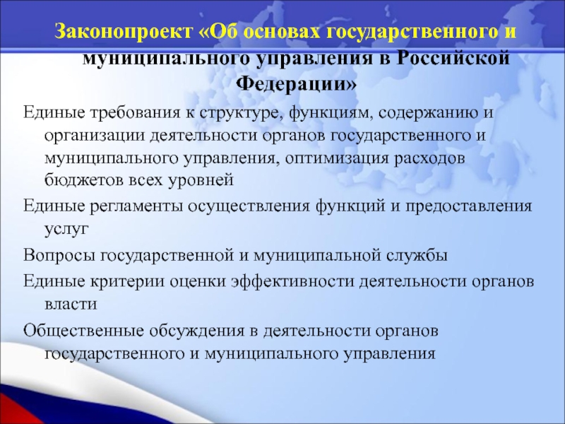 Слайд 12Законопроект «Об основах государственного и муниципального управления в Российской Федерации»