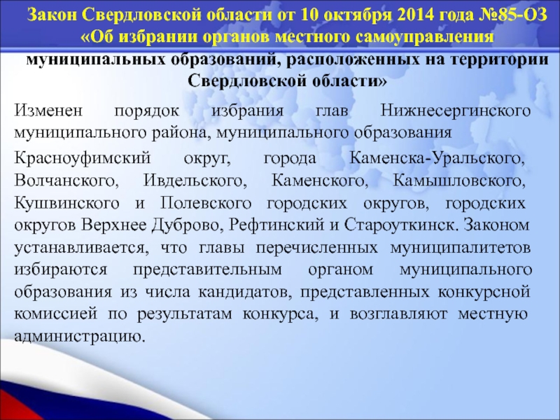 Закон Свердловской области от 10 октября 2014 года №85-ОЗ «Об избрании органов местного самоуправления муниципальных образований, расположенных на территории Свердловской области»