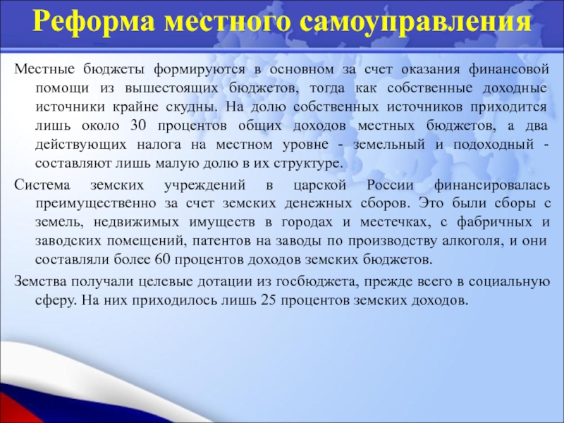 Система земских учреждений в царской России финансировалась преимущественно за счет земских денежных сборов. Это были сборы с земель, недвижимых имуществ в городах и местечках, с фабричных и заводских помещений, патентов на заводы по производству алкоголя, и они составляли более 60 процентов доходов земских бюджетов.