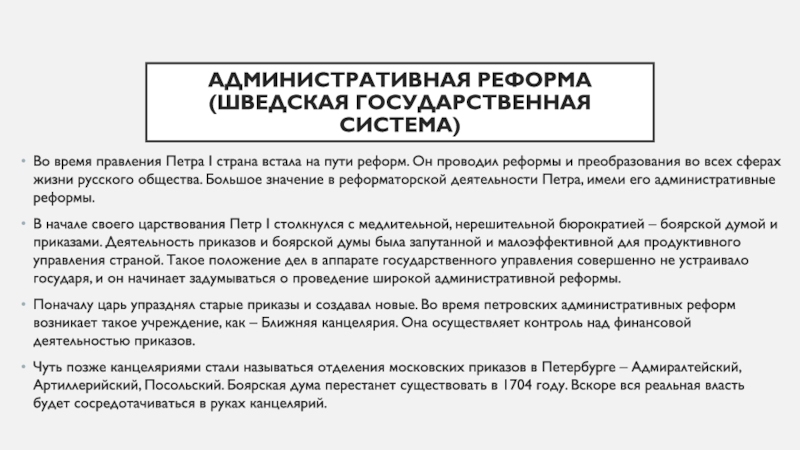 В начале своего царствования Петр I столкнулся с медлительной, нерешительной бюрократией – боярской думой и приказами. Деятельность приказов и боярской думы была запутанной и малоэффективной для продуктивного управления страной. Такое положение дел в аппарате государственного управления совершенно не устраивало государя, и он начинает задумываться о проведение широкой административной реформы.