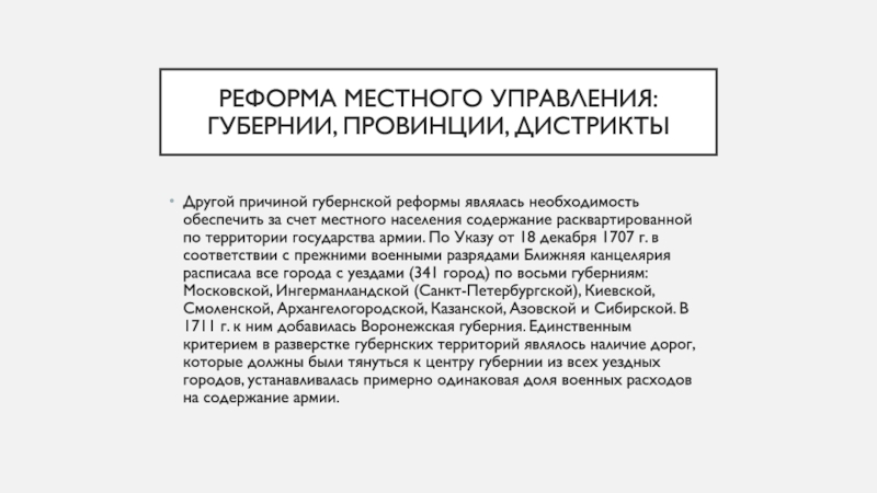 государства армии. По Указу от 18 декабря 1707 г. в соответствии с прежними военными разрядами Ближняя канцелярия расписала все города с уездами (341 город) по восьми губерниям: Московской, Ингерманландской (Санкт-Петербургской), Киевской, Смоленской, Архангелогородской, Казанской, Азовской и Сибирской. В 1711 г. к ним добавилась Воронежская губерния. Единственным критерием в разверстке губернских территорий являлось наличие дорог, которые должны были тянуться к центру губернии из всех уездных городов, устанавливалась примерно одинаковая доля военных расходов на содержание армии.