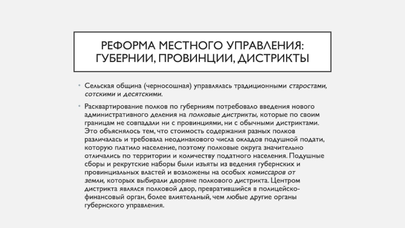 дистрикты, которые по своим границам не совпадали ни с провинциями, ни с обычными дистриктами. Это объяснялось тем, что стоимость содержания разных полков различалась и требовала неодинакового числа окладов подушной подати, которую платило население, поэтому полковые округа значительно отличались по территории и количеству податного населения. Подушные сборы и рекрутские наборы были изъяты из ведения губернских и провинциальных властей и возложены на особых комиссаров от земли, которых выбирали дворяне полкового дистрикта. Центром дистрикта являлся полковой двор, превратившийся в полицейско-финансовый орган, более влиятельный, чем любые другие органы губернского управления.