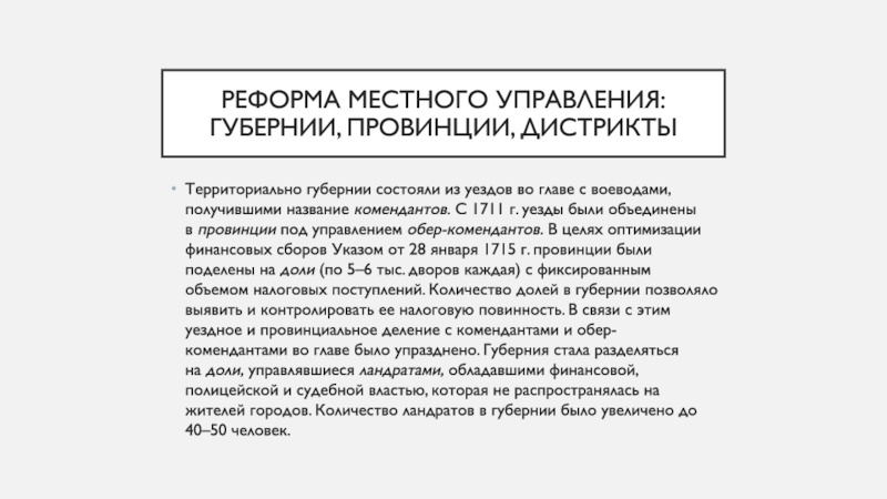 объединены в провинции под управлением обер-комендантов. В целях оптимизации финансовых сборов Указом от 28 января 1715 г. провинции были поделены на доли (по 5–6 тыс. дворов каждая) с фиксированным объемом налоговых поступлений. Количество долей в губернии позволяло выявить и контролировать ее налоговую повинность. В связи с этим уездное и провинциальное деление с комендантами и обер-комендантами во главе было упразднено. Губерния стала разделяться на доли, управлявшиеся ландратами, обладавшими финансовой, полицейской и судебной властью, которая не распространялась на жителей городов. Количество ландратов в губернии было увеличено до 40–50 человек.