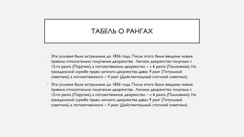 Эти условия были актуальным до 1856 года. После этого были введены новые правила относительно получения дворянства. Личное дворянство получали с 12-го ранга (Поручик), а потомственное дворянство – с 6 ранга (Полковник). На гражданской службе право личного дворянства давал 9 ранг (Титульный советник), а потомственного – 4 ранг (Действительный статский советник).