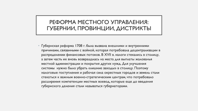 децентрализации в распределении финансовых потоков. В XVII в. налоги стекались в столицу, а затем часть их вновь возвращалась на места для выплаты жалованья местной администрации и покрытия других нужд. Для улучшения системы нужно было убрать «лишние заходы» в столицу. Поэтому налоговые поступления и рабочая сила окрестных городов и земель стали стекаться к важным военно-стратегическим центрам, что потребовало расширения компетенции местных воевод, которые еще до введения губернского деления стали называться губернаторами.