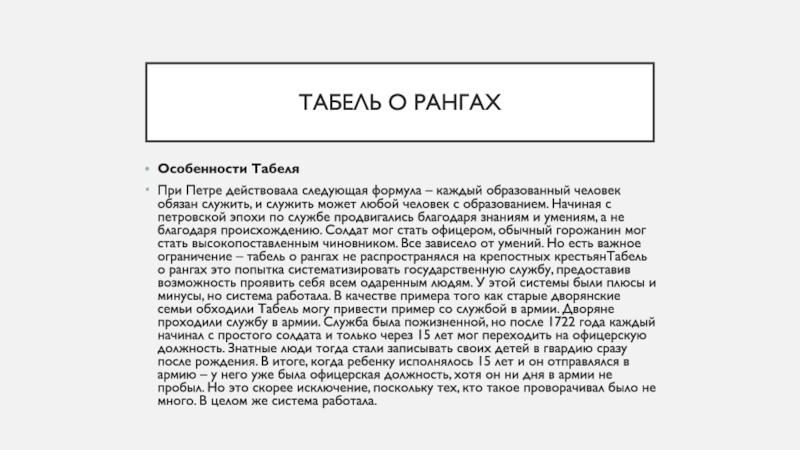 образованием. Начиная с петровской эпохи по службе продвигались благодаря знаниям и умениям, а не благодаря происхождению. Солдат мог стать офицером, обычный горожанин мог стать высокопоставленным чиновником. Все зависело от умений. Но есть важное ограничение – табель о рангах не распространялся на крепостных крестьянТабель о рангах это попытка систематизировать государственную службу, предоставив возможность проявить себя всем одаренным людям. У этой системы были плюсы и минусы, но система работала. В качестве примера того как старые дворянские семьи обходили Табель могу привести пример со службой в армии. Дворяне проходили службу в армии. Служба была пожизненной, но после 1722 года каждый начинал с простого солдата и только через 15 лет мог переходить на офицерскую должность. Знатные люди тогда стали записывать своих детей в гвардию сразу после рождения. В итоге, когда ребенку исполнялось 15 лет и он отправлялся в армию – у него уже была офицерская должность, хотя он ни дня в армии не пробыл. Но это скорее исключение, поскольку тех, кто такое проворачивал было не много. В целом же система работала.