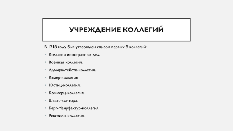 В 1718 году был утвержден список первых 9 коллегий: