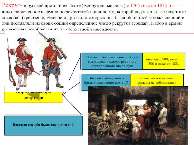 Рекрут- в русской армии и во флоте (Вооружённые силы) с 1705 года по 1874 год — лицо, зачисленное в армию по рекрутской повинности, которой подлежали все податные сословия (крестьяне, мещане и др.) и для которых она была общинной и пожизненной и они поставляли из своих общин определенное число рекрутов (солдат). Набор в армию крепостных освобождал их от крепостной зависимости.