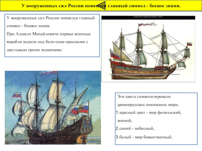 При Алексее Михайловиче первые военные корабли ходили под бело-сине-красными с двуглавым орлом знаменами.