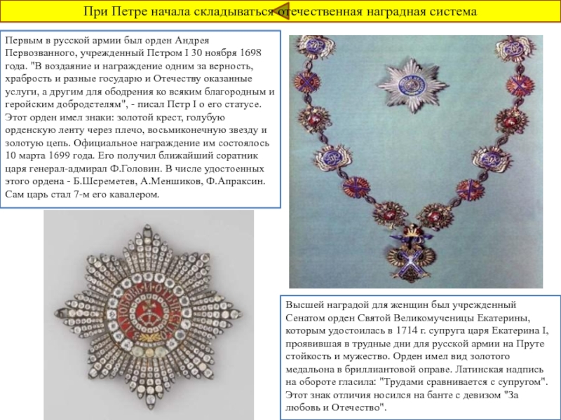 Высшей наградой для женщин был учрежденный Сенатом орден Святой Великомученицы Екатерины, которым удостоилась в 1714 г. супруга царя Екатерина I, проявившая в трудные дни для русской армии на Пруте стойкость и мужество. Орден имел вид золотого медальона в бриллиантовой оправе. Латинская надпись на обороте гласила: "Трудами сравнивается с супругом". Этот знак отличия носился на банте с девизом "За любовь и Отечество".