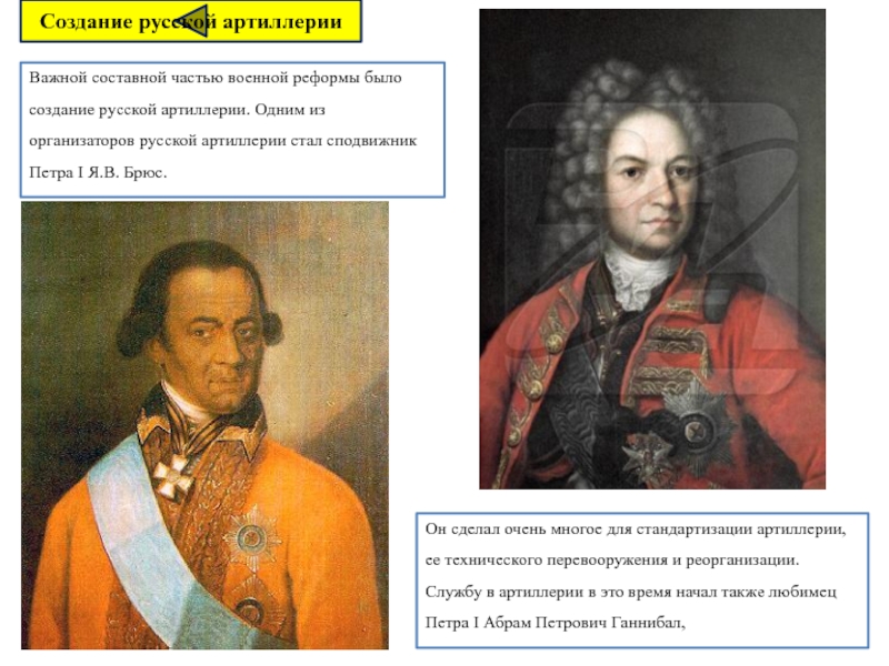 Важной составной частью военной реформы было создание русской артиллерии. Одним из организаторов русской артиллерии стал сподвижник Петра I Я.В. Брюс.