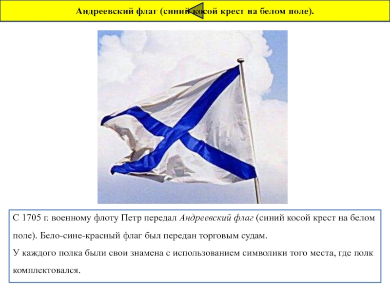 С 1705 г. военному флоту Петр передал Андреевский флаг (синий косой крест на белом поле).