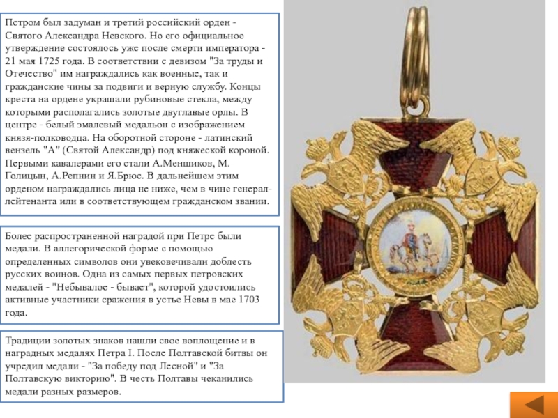 Традиции золотых знаков нашли свое воплощение и в наградных медалях Петра I. После Полтавской битвы он учредил медали - "За победу под Лесной" и "За Полтавскую викторию". В честь Полтавы чеканились медали разных размеров.