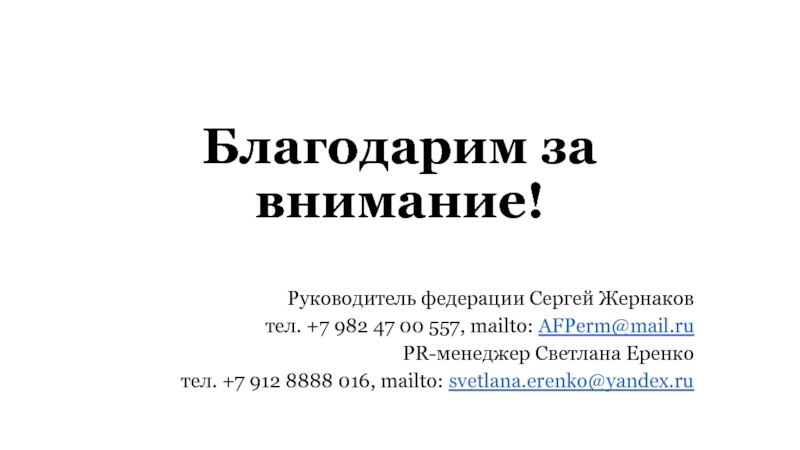 Благодарим за внимание!Руководитель федерации Сергей Жернаковтел. +7 982 47 00 557, mailto: AFPerm@mail.ru PR-менеджер Светлана Еренкотел. +7