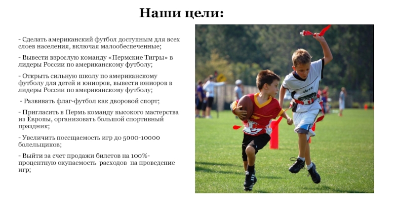 Наши цели:- Сделать американский футбол доступным для всех слоев населения, включая малообеспеченные;- Вывести взрослую команду «Пермские Тигры»