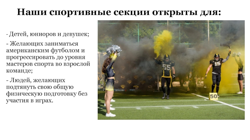 Наши спортивные секции открыты для: - Детей, юниоров и девушек;- Желающих заниматься американским футболом и прогрессировать до