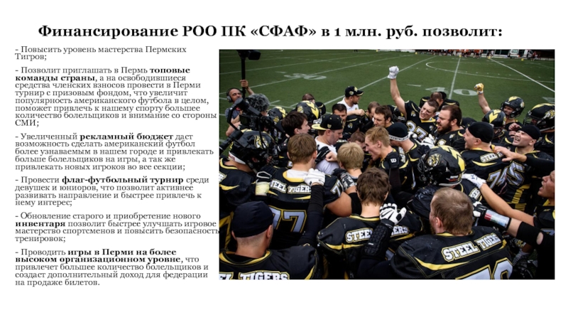 Финансирование РОО ПК «СФАФ» в 1 млн. руб. позволит:- Повысить уровень мастерства Пермских Тигров;- Позволит приглашать в