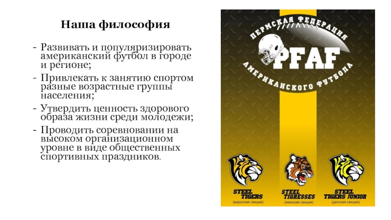Наша философияРазвивать и популяризировать американский футбол в городе и регионе;Привлекать к занятию спортом разные возрастные группы населения;Утвердить