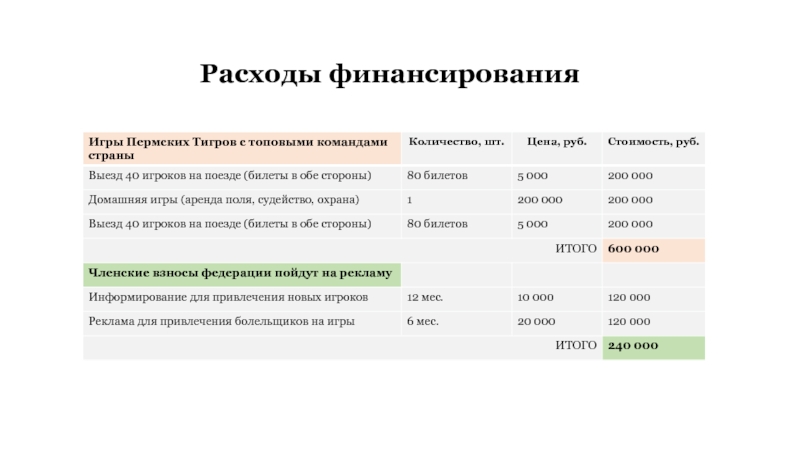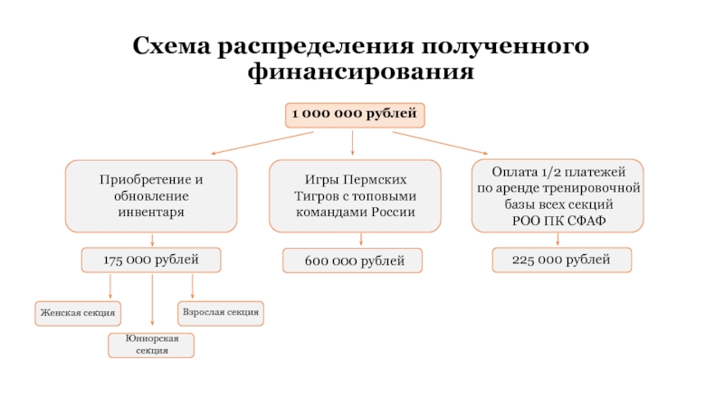 Схема распределения полученного финансирования1 000 000 рублейПриобретение и обновление инвентаряИгры ПермскихТигров с топовымикомандами РоссииОплата 1/2 платежейпо аренде