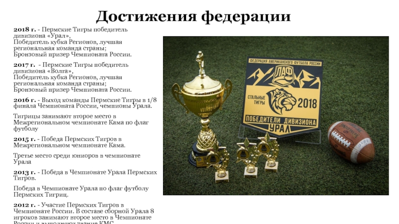 Достижения федерации2018 г. - Пермские Тигры победитель дивизиона «Урал», Победитель кубка Регионов, лучшая региональная команда страны; Бронзовый