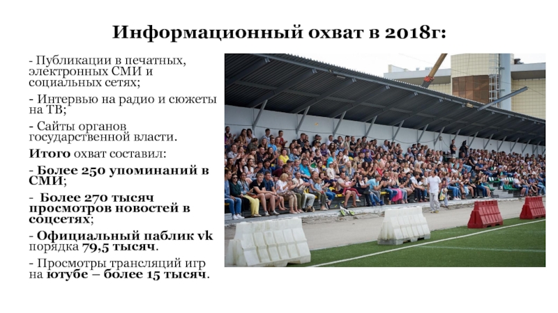 Информационный охват в 2018г:- Публикации в печатных, электронных СМИ и социальных сетях;- Интервью на радио и сюжеты