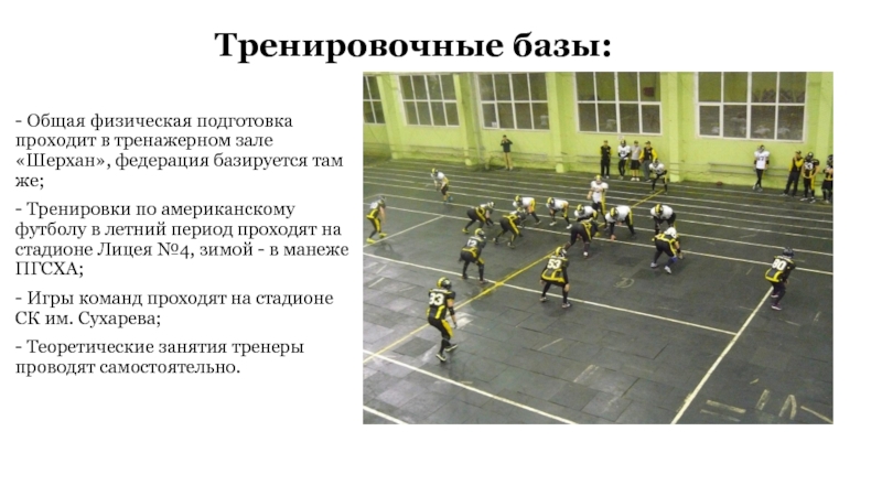 Тренировочные базы:- Общая физическая подготовка проходит в тренажерном зале «Шерхан», федерация базируется там же;- Тренировки по американскому