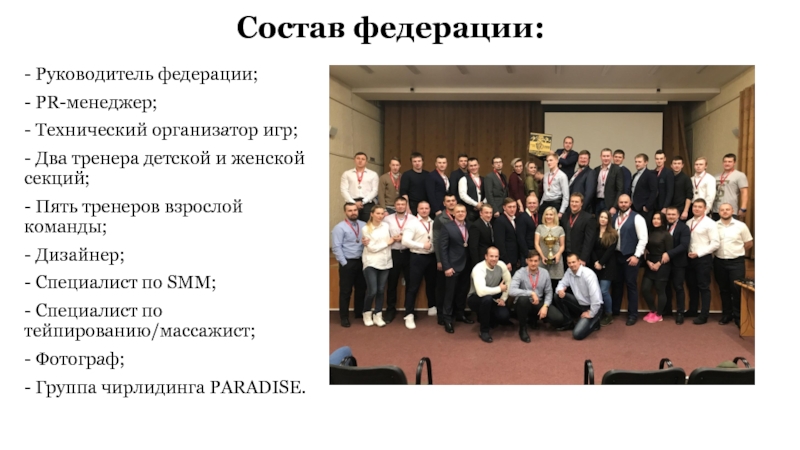 Состав федерации: - Руководитель федерации;- PR-менеджер;- Технический организатор игр;- Два тренера детской и женской секций;- Пять тренеров