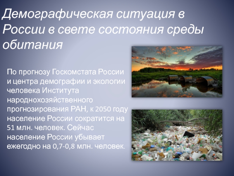 Демографическая ситуация в России в свете состояния среды обитанияПо прогнозу Госкомстата России и центра демографии и экологии