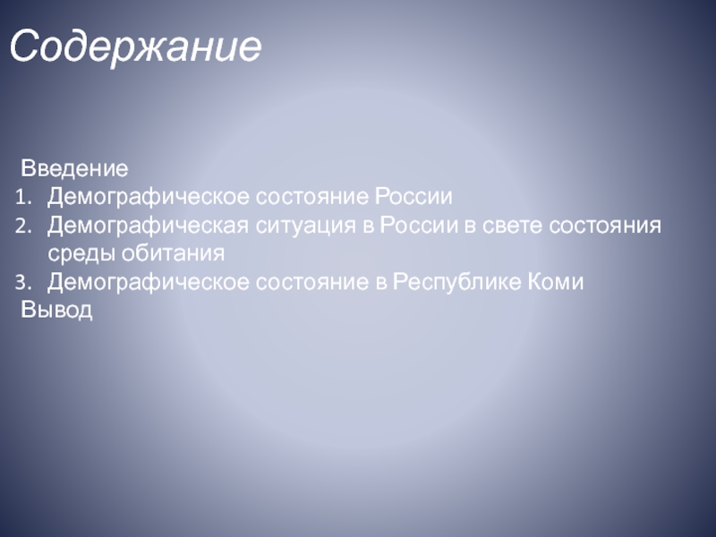 СодержаниеВведение Демографическое состояние РоссииДемографическая ситуация в России в свете состояния среды обитанияДемографическое состояние в Республике КомиВывод