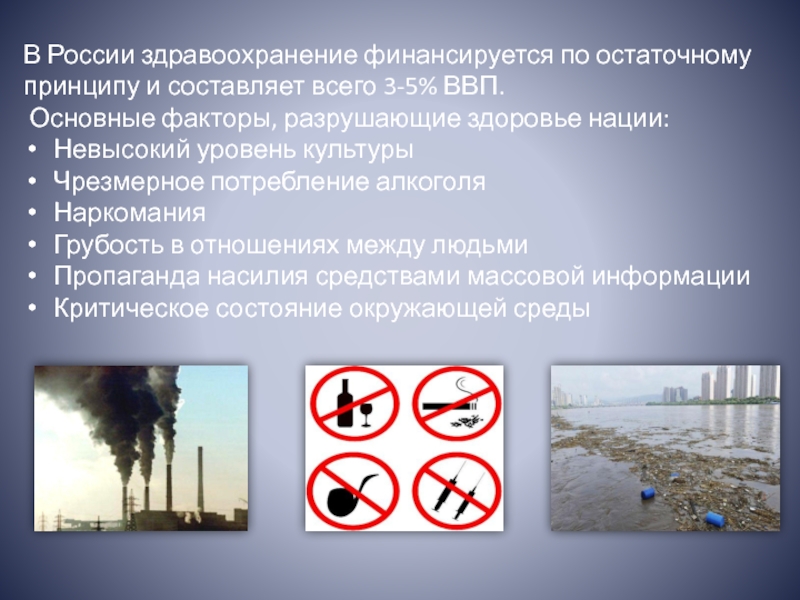 В России здравоохранение финансируется по остаточному принципу и составляет всего 3-5% ВВП. Основные факторы, разрушающие здоровье нации:
