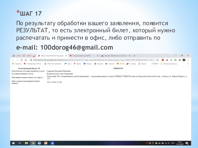 ШАГ 17По результату обработки вашего заявления, появится РЕЗУЛЬТАТ, то есть электронный билет, который нужно распечатать и принести