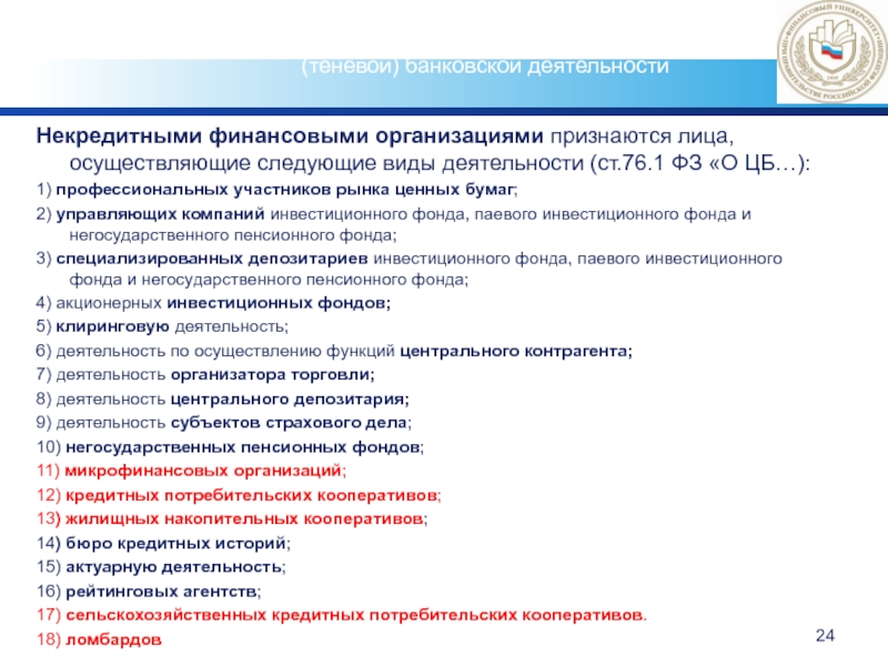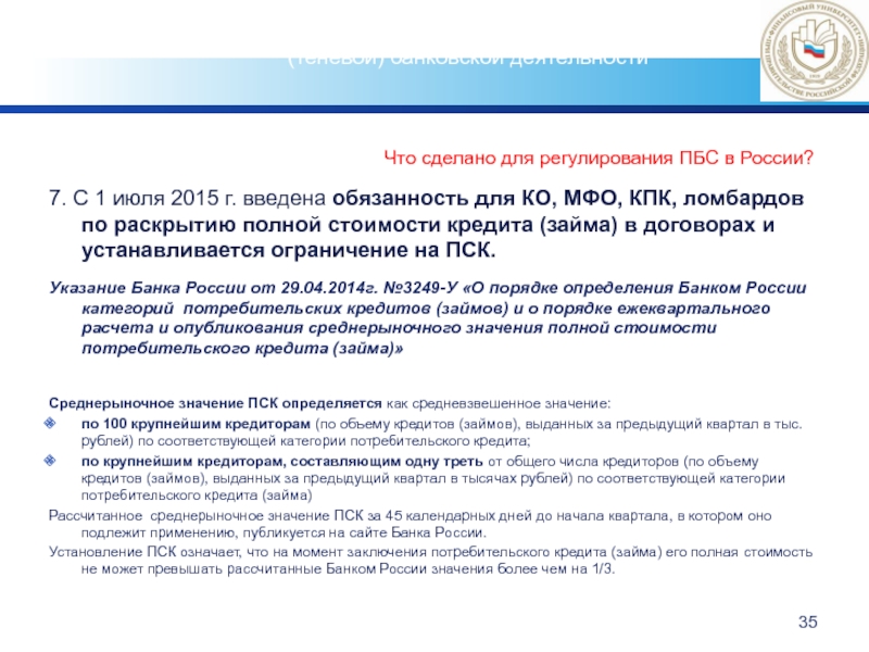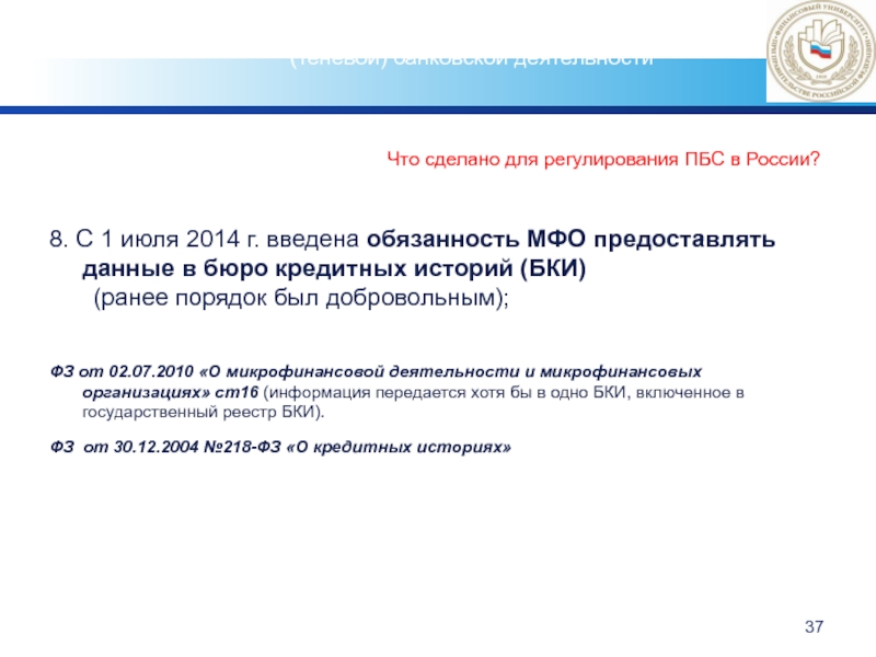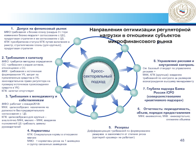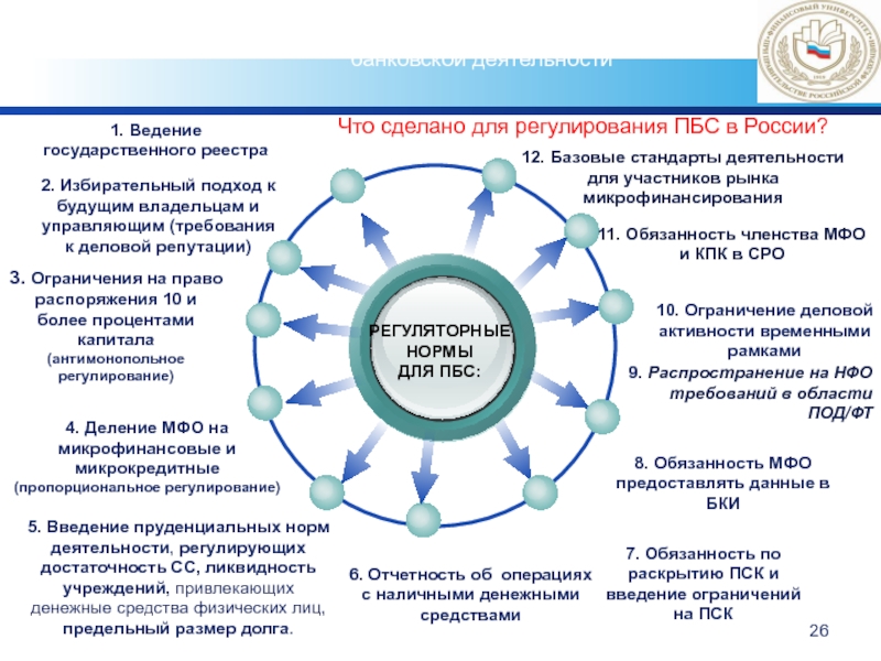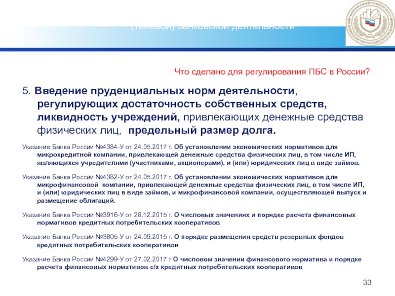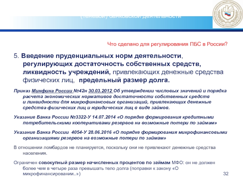 5. Введение пруденциальных норм деятельности, регулирующих достаточность СС, ликвидность учреждений, привлекающих денежные средства физических лиц, предельный размер долга.