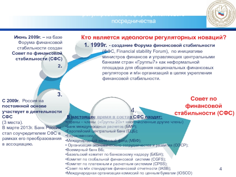 1. 1999г. - создание Форума финансовой стабильности (ФФС, Financial stability Forum), по инициативе министров финансов и управляющих центральными банками стран «Группы7» как неформальной площадка для общения национальных финансовых регуляторов и м\н организаций в целях укрепления финансовой стабильности.