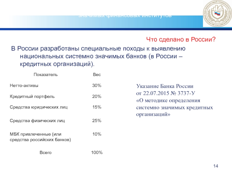 Указание Банка России от 22.07.2015 № 3737-У «О методике определения системно значимых кредитных организаций»