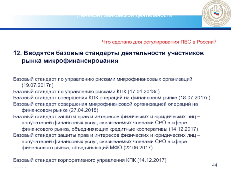 12. Базовые стандарты деятельности для участников рынка микрофинансирования