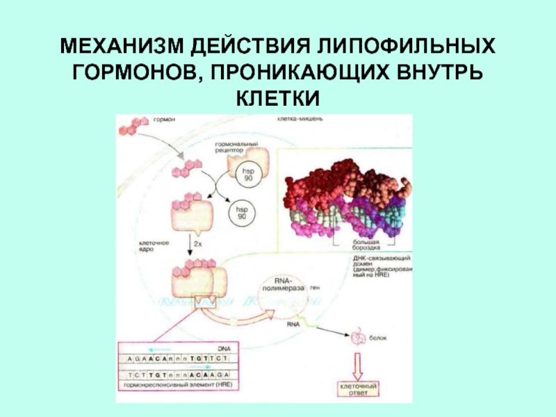Слайд 31МЕХАНИЗМ ДЕЙСТВИЯ ЛИПОФИЛЬНЫХ ГОРМОНОВ, ПРОНИКАЮЩИХ ВНУТРЬ КЛЕТКИ