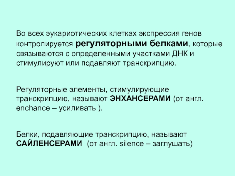 Слайд 23Во всех эукариотических клетках экспрессия генов контролируется регуляторными белками, которые