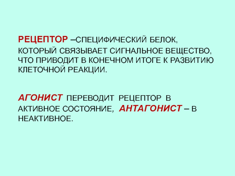 Слайд 38РЕЦЕПТОР –СПЕЦИФИЧЕСКИЙ БЕЛОК, КОТОРЫЙ СВЯЗЫВАЕТ СИГНАЛЬНОЕ ВЕЩЕСТВО, ЧТО ПРИВОДИТ В