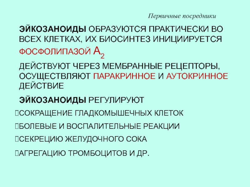 ДЕЙСТВУЮТ ЧЕРЕЗ МЕМБРАННЫЕ РЕЦЕПТОРЫ, ОСУЩЕСТВЛЯЮТ ПАРАКРИННОЕ И АУТОКРИННОЕ ДЕЙСТВИЕ