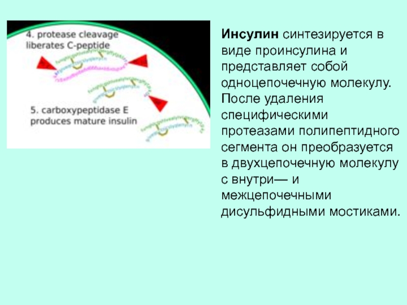 Слайд 16Инсулин синтезируется в виде проинсулина и представляет собой одноцепочечную молекулу.