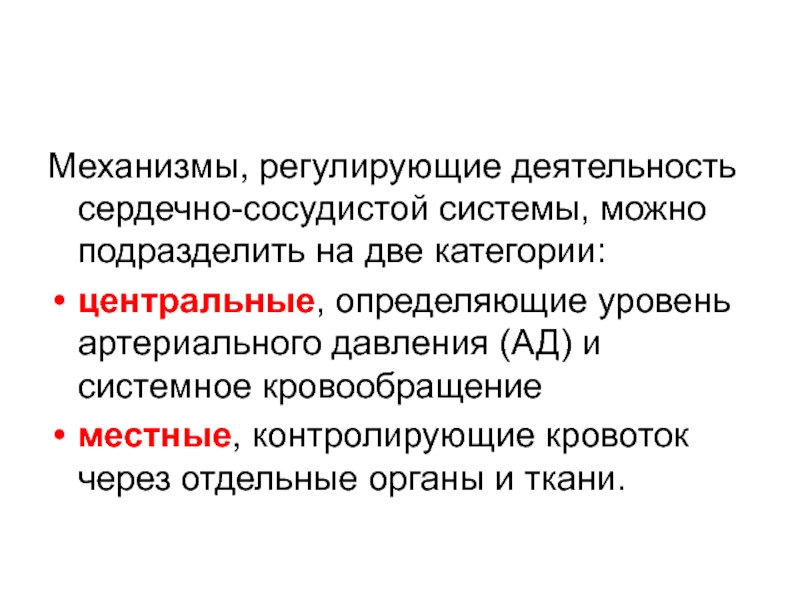 Слайд 5Механизмы, регулирующие деятельность сердечно-сосудистой системы, можно подразделить на две категории: