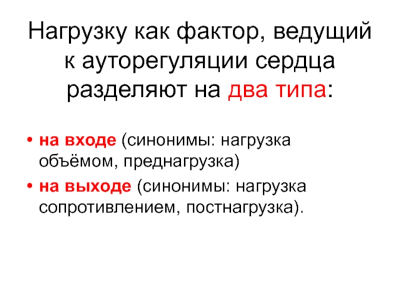 Слайд 15Нагрузку как фактор, ведущий к ауторегуляции сердца разделяют на два