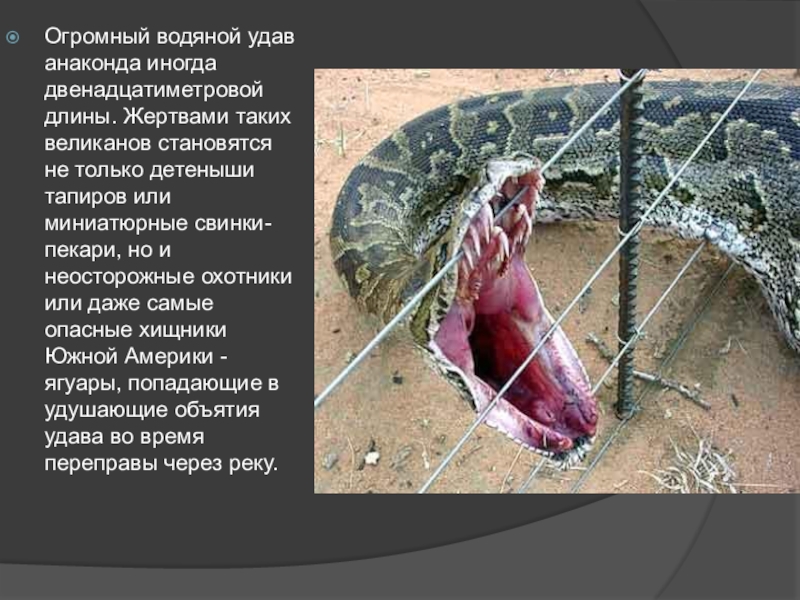 Слайд 19Огромный водяной удав анаконда иногда двенадцатиметровой длины. Жертвами таких великанов