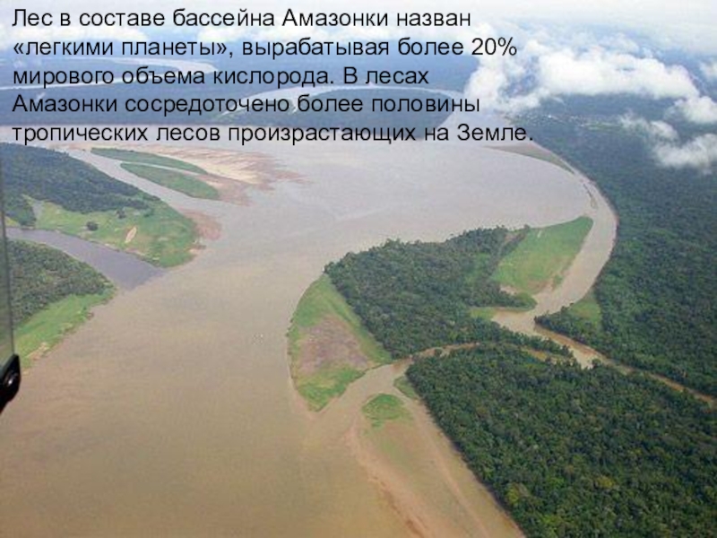 Слайд 21Лес в составе бассейна Амазонки назван «легкими планеты», вырабатывая более 20% мирового