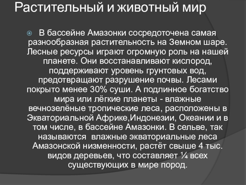 разнообразная растительность на Земном шаре. Лесные ресурсы играют огромную роль на нашей планете. Они восстанавливают кислород, поддерживают уровень грунтовых вод, предотвращают разрушение почвы. Лесами покрыто менее 30% суши. А подлинное богатство мира или лёгкие планеты - влажные вечнозелёные тропические леса, расположены в Экваториальной Африке,Индонезии, Океании и в том числе, в бассейне Амазонки. В сельве, так называются влажные экваториальные леса Амазонской низменности, растёт свыше 4 тыс. видов деревьев, что составляет ¼ всех существующих в мире пород.