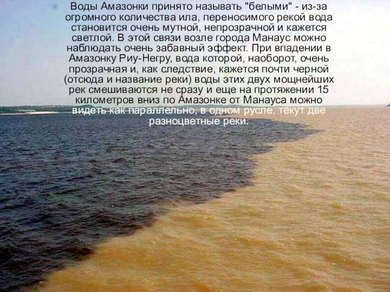 Слайд 11Воды Амазонки принято называть "белыми" - из-за огромного количества ила,